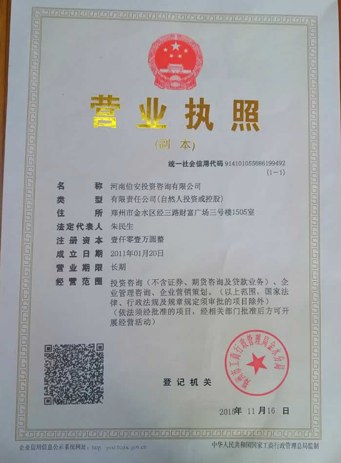 河南伯安投資咨詢有限公司是一家專門面向企業和個人提供投融資、客戶理財、企業管理、營銷策劃、咨詢等專業化金融服務公司。公司本著“誠信為本、專業領先、 創新服務 、共贏發展”的經營理念,以“搭建平臺、 專業咨詢、 誠信至上、服務客戶”為服務宗旨,著力打造高效、專業的金融服務平臺。本公司擁有一支復合型專業團隊,同時具有一支專業化風險管理、企業策劃、創意設計…......