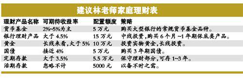 該類家庭可以采取穩(wěn)健理財(cái)?shù)姆绞剑嘣顿Y養(yǎng)老,用投資收益補(bǔ)充退休金的不足部分。本方案可主要選擇銀行理財(cái)產(chǎn)品、貨幣基金與黃金等屬于風(fēng)險(xiǎn)較小、可期待收益率中等的產(chǎn)品。貨幣基金充當(dāng)家庭“應(yīng)急準(zhǔn)備金”,配置比例應(yīng)高于中年、年輕家庭的一倍,4萬~5萬元為適宜,以應(yīng)對“突然住院”等急事;平時(shí)退休金的結(jié)余部分,也可直接在銀行卡上購買成貨幣基金,增加收益率。